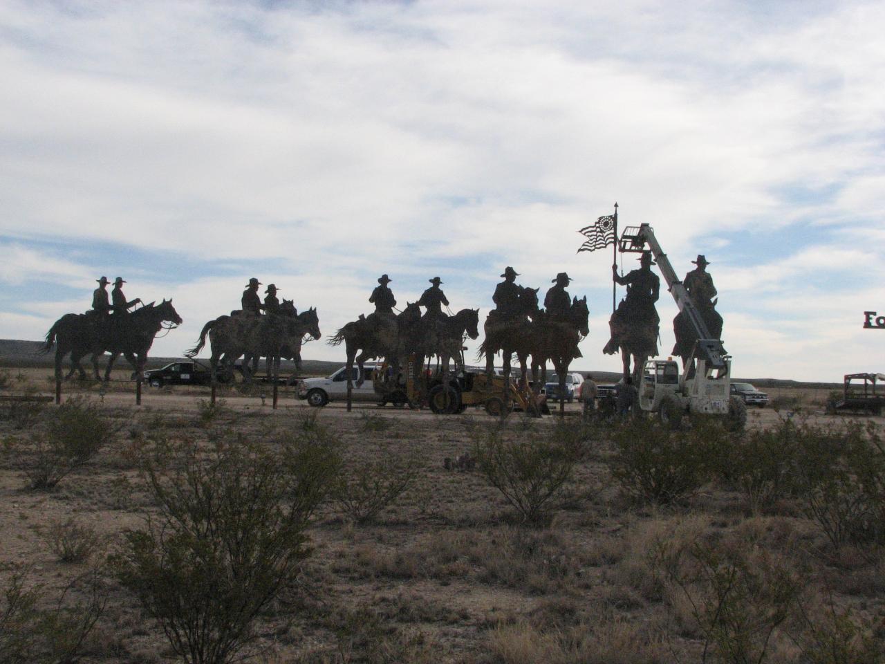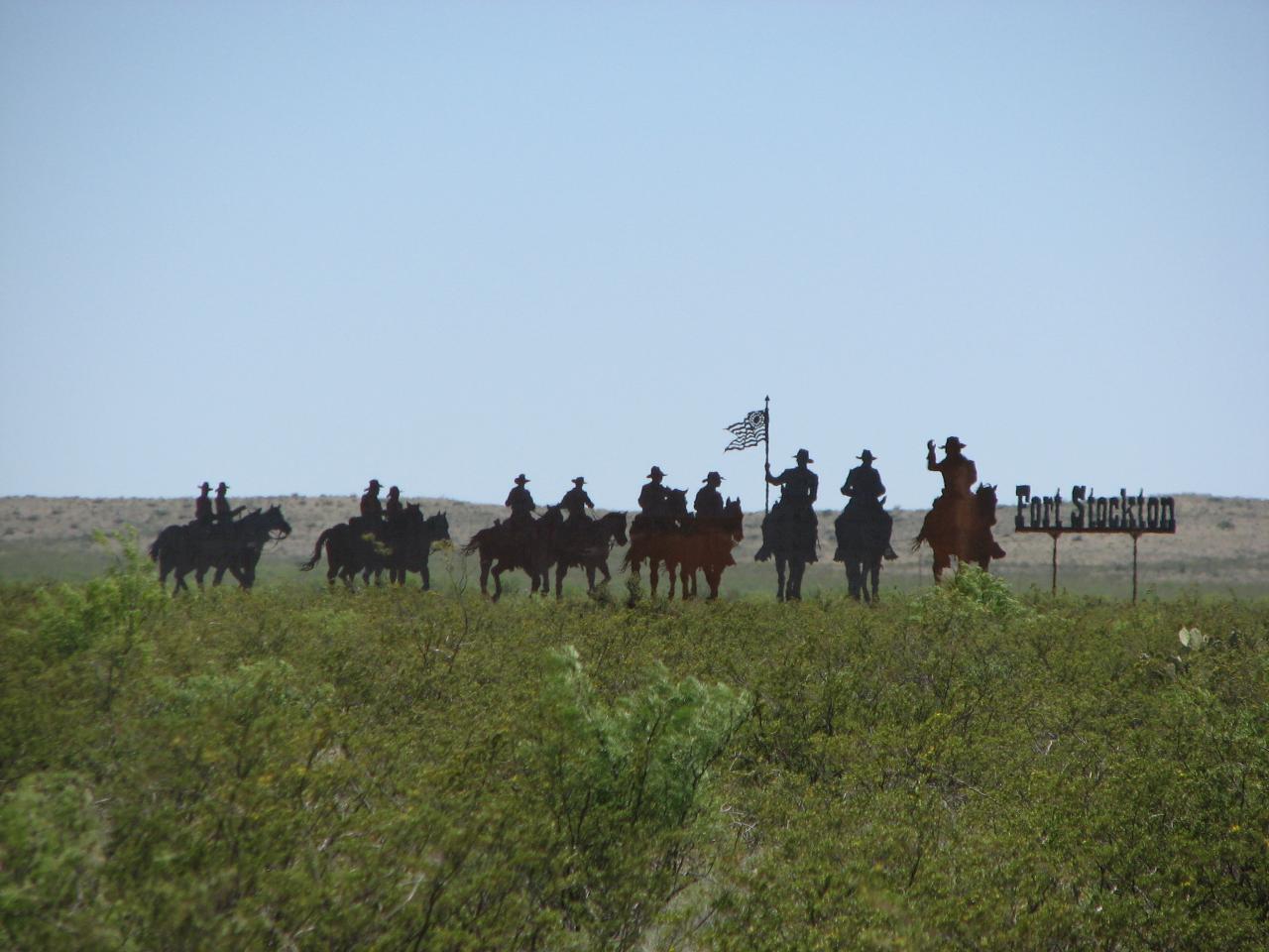 A company of U.S. Cavalry follows their captain toward Fort Stockton--and home-- in "Marching to Fort Stockton". These silhouettes can be seen just south of Interstate-10, about one and a half miles east of the Mararthon exit. Look for the old adobe airplane hangar near the highway. The silhouettes are to the south.