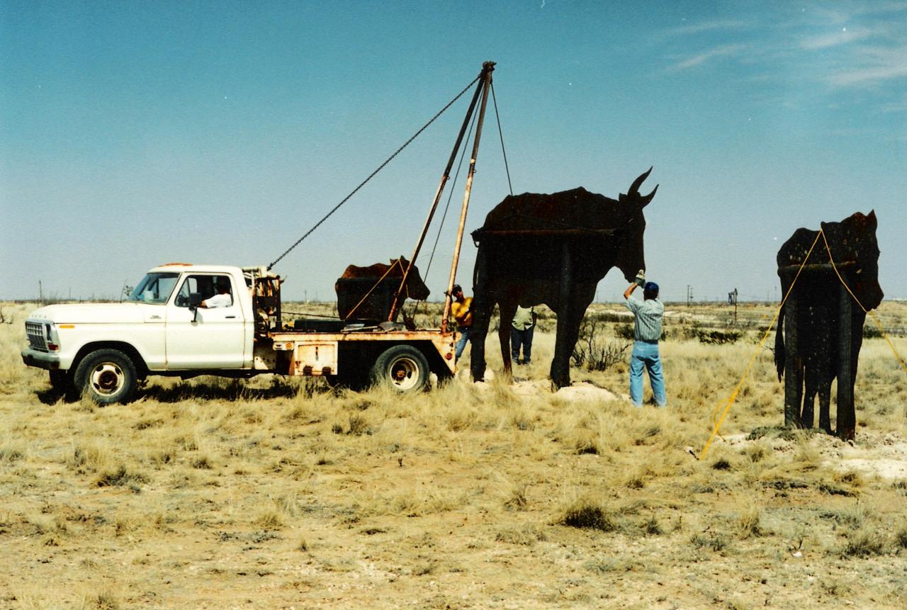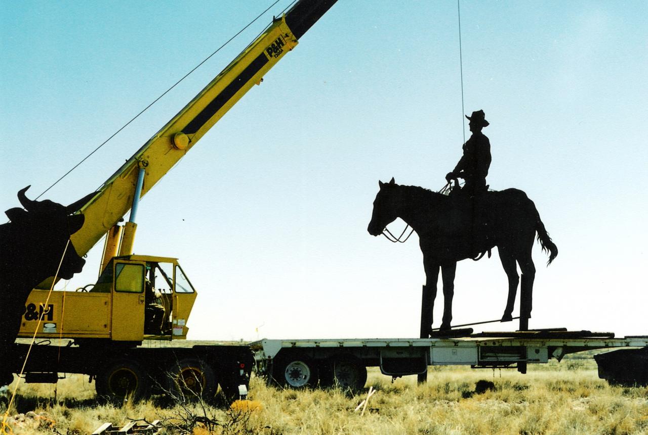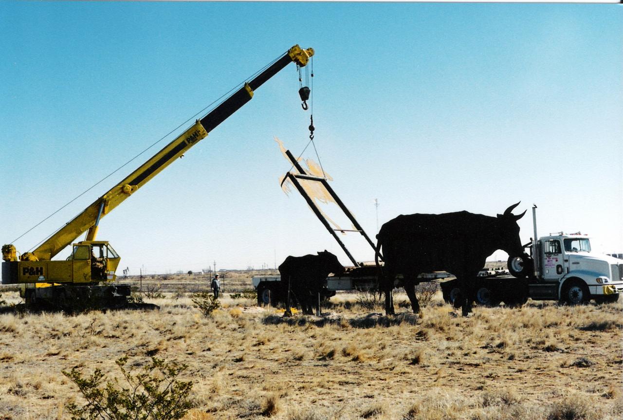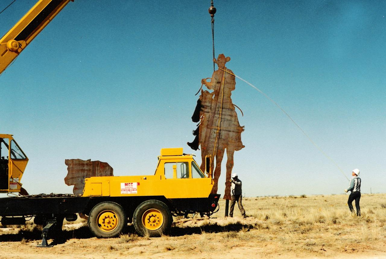 The last Friday of each month, the Jal Chamber of Commerce puts on a community breakfast. At the January 1999 breakfast, I announced the project and began soliciting donations. I left the breakfast that morning with a pledge for a $1,000.00 donation. Word of the project reached planners for a scheduled Jal school reunion and the news hit the internet. Soon, donations were coming in at a rapid pace as Jal residents and former residents--some of whom had not lived in Jal for more than 50 years--gave money to help their hometown. In just a few months, enough money was raised to begin construction. And by March 17th, 2000, with a great deal of help from Jal resident Gene Armstrong, the sculpture was complete.